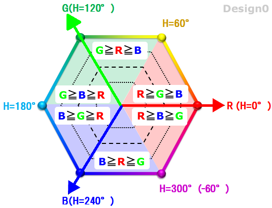 R≧G≧B: 0°≦H≦60°